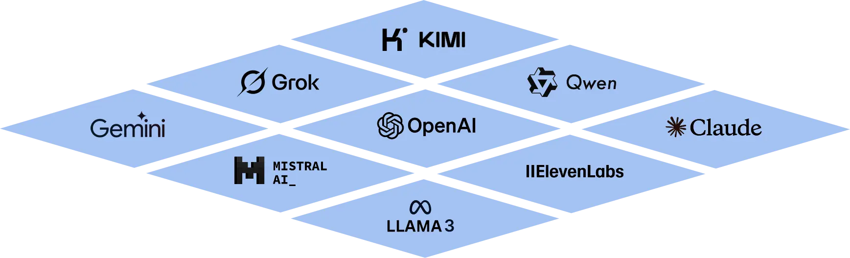 Sitting between your infrastructure and processes, our application layer orchestrates models, data flows and integrations. It decouples agents from providers so you stay agile and up to date with the latest AI advances.